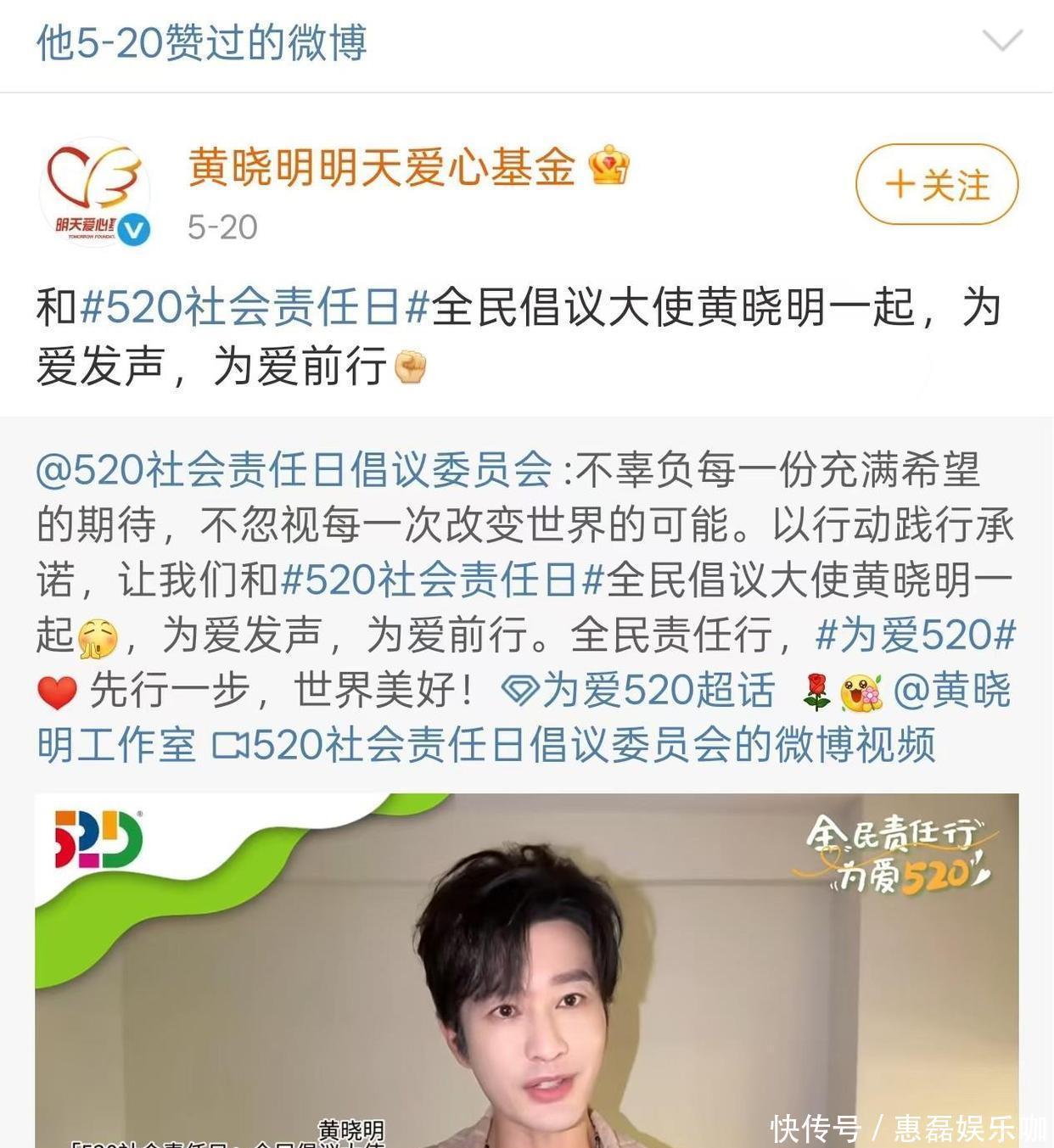 5月20日,黄晓明基金会在微博上发了个视频,配文是“和全民倡益大使黄晓明沿途,为爱发声,为爱前行。”
