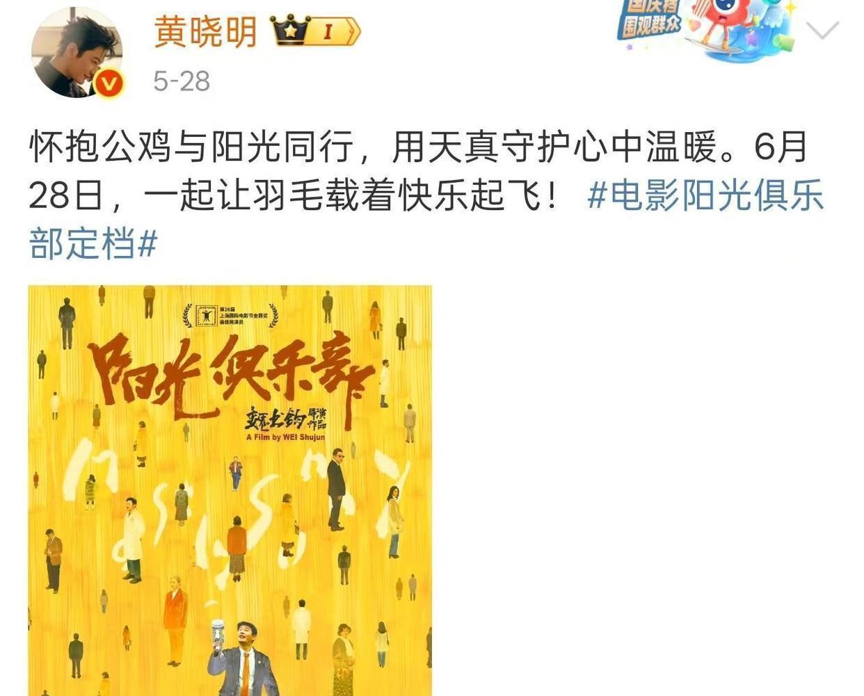 5月28日,黄晓明跑到微博上给新片《阳光俱乐部》打了个告白。