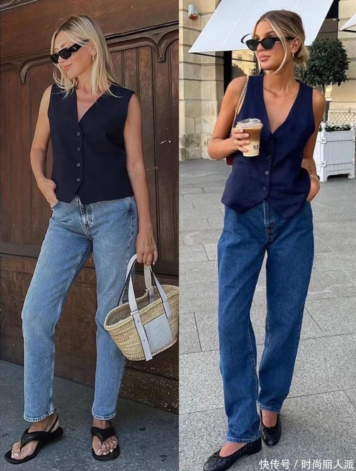 一般来说,对于马甲这件单品,十分百搭的裤装无非即是牛仔裤和西装裤了。